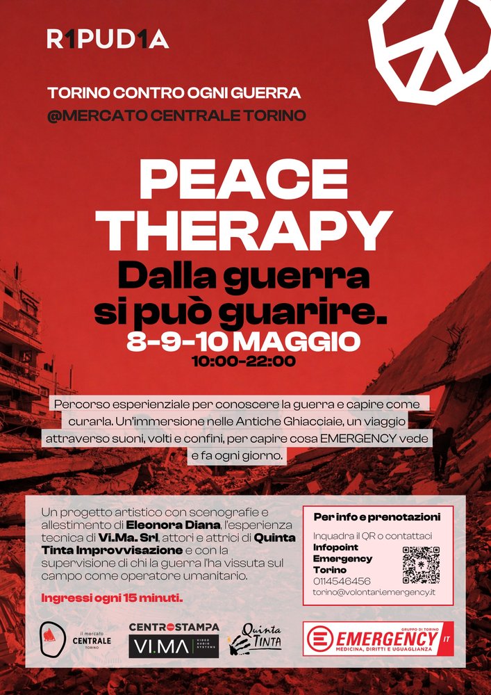 8-9-10 maggio 2026 Emergency presenta l'evento PEACE THERAPY - Dalla guerra si può guarire. Percorso immersivo all’interno delle storiche Antiche Ghiacciaie del Mercato Centrale Torino.
