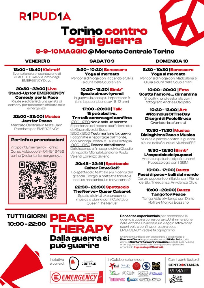 Dal 8 al 10 maggio 2026 Torino ospita un appuntamento dedicato alla pace e alla memoria civile. Gli spazi di Mercato Centrale Torino si trasformeranno in un luogo di incontro, testimonianze e cultura con “R1PUD1A | Torino contro ogni guerra”, il festival promosso da EMERGENCY.
